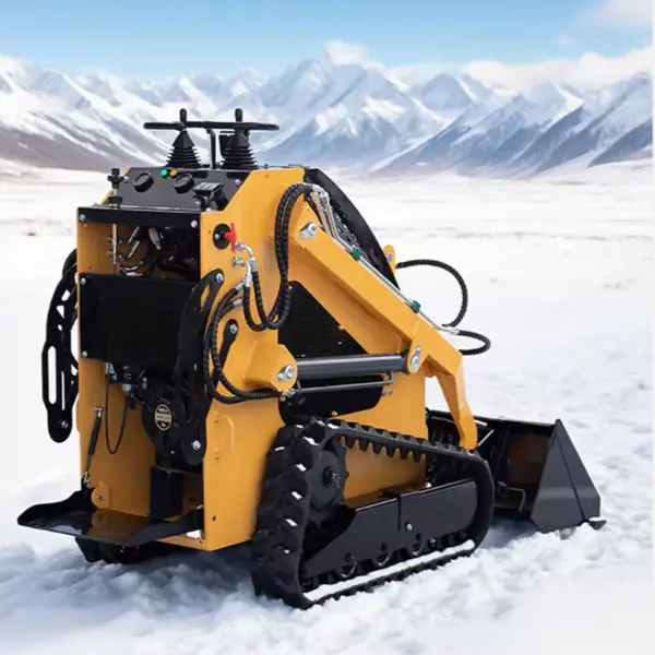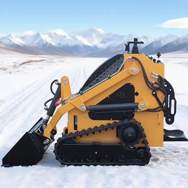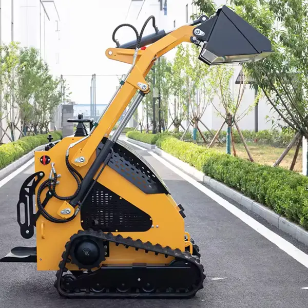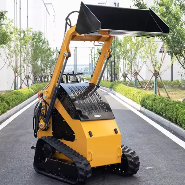 Compact Skid Steer Loader Front Mini Loader unggul dalam memindahkan palet dan inventaris di lorong penyimpanan yang sempit. Ketinggiannya yang ringkas (≤2m) dan putaran dengan radius nol memungkinkan bongkar muat yang efisien di bawah langit-langit rendah dan di sudut bengkel yang sempit.